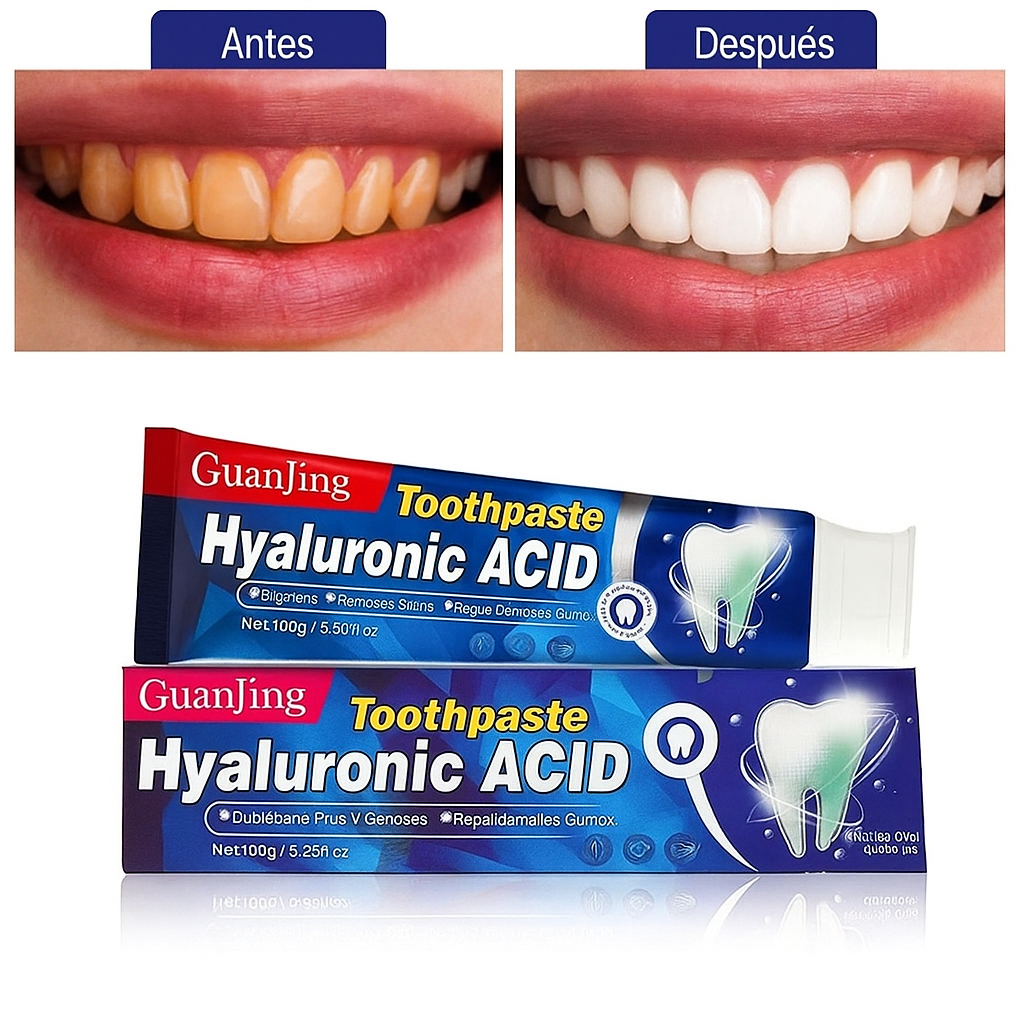 Nuestra innovadora pasta de dientes con ácido hialurónico, vitamina E y aminoácidos, combate las manchas, el mal aliento y fortalece tus encías, dejándote una sensación de frescura y limpieza total.